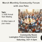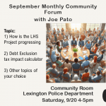 Community Room – Lexington Police DepartmentSaturday, 9/20 4-5pm Topic:LHS Project progress, tax impact calculator and other topics of your choosing. - August Monthly Community Forum